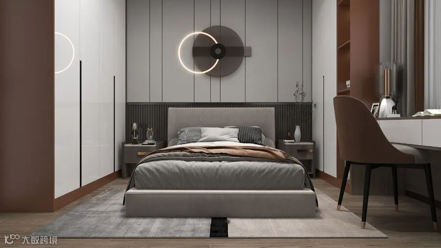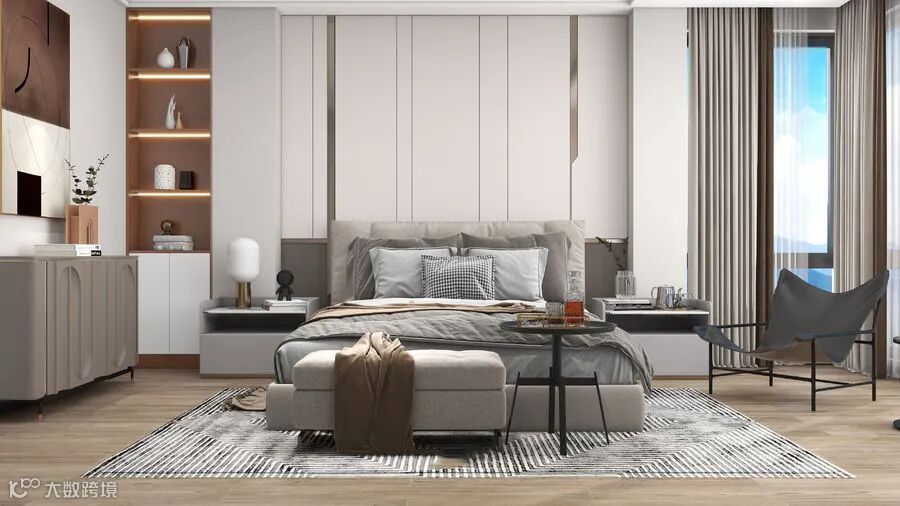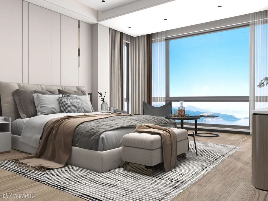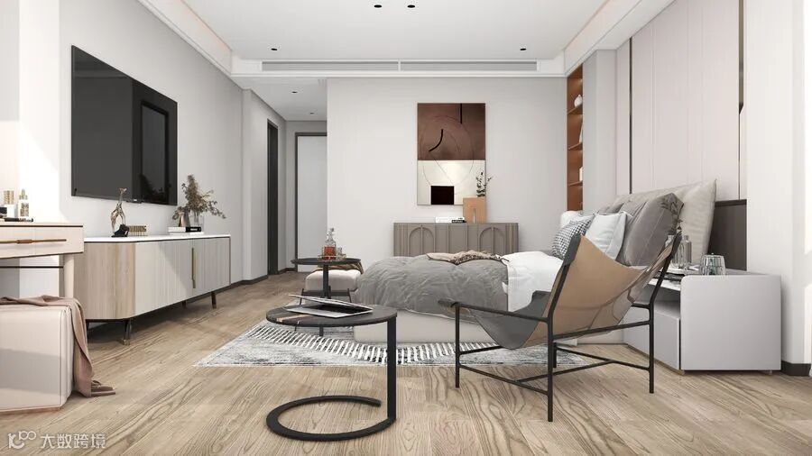 一整面墙的落地窗可以为空间带来充足光线,临窗的靠椅和几何茶几组合便是一处休闲区;里侧边柜布置满足日常收纳,配合画饰点缀也不失沉静气质;床品选择则贴合空间整体基调,灰面与棕的搭配也能给人以温柔而舒适的印象。