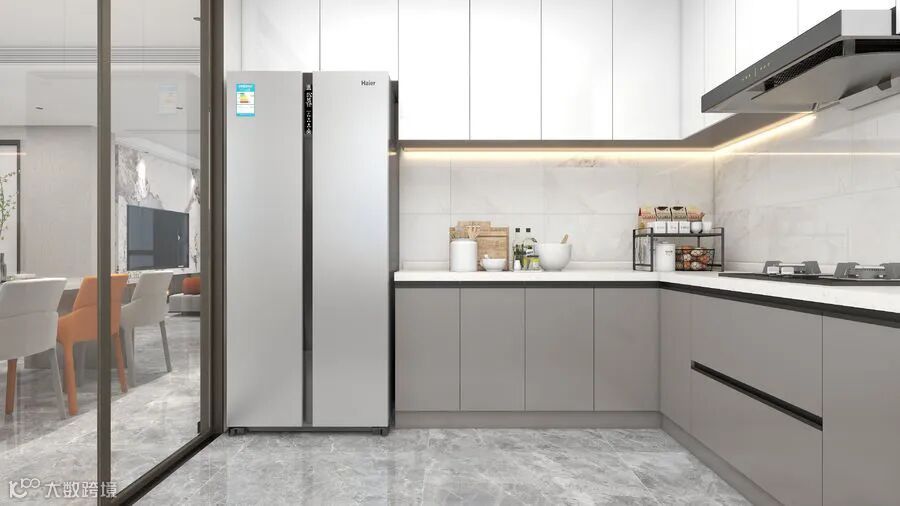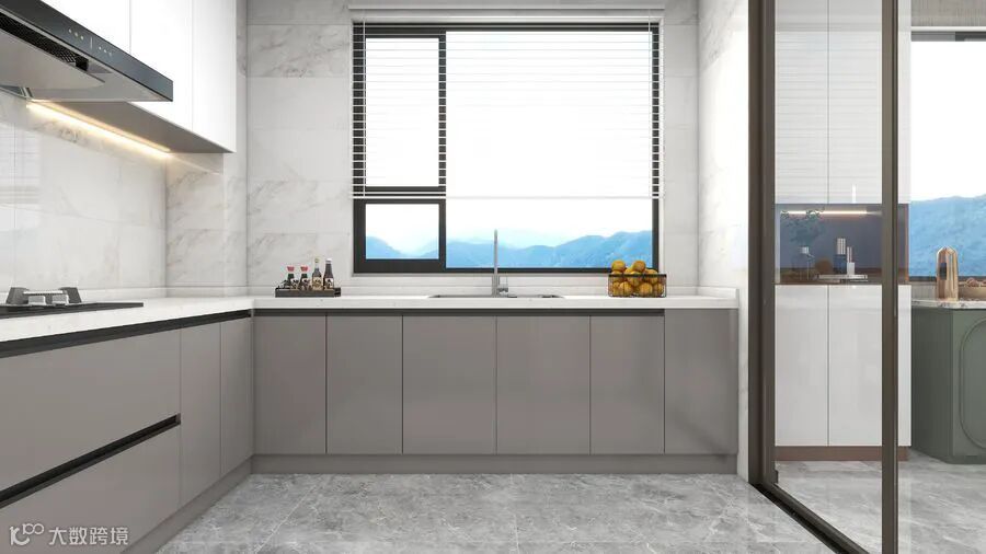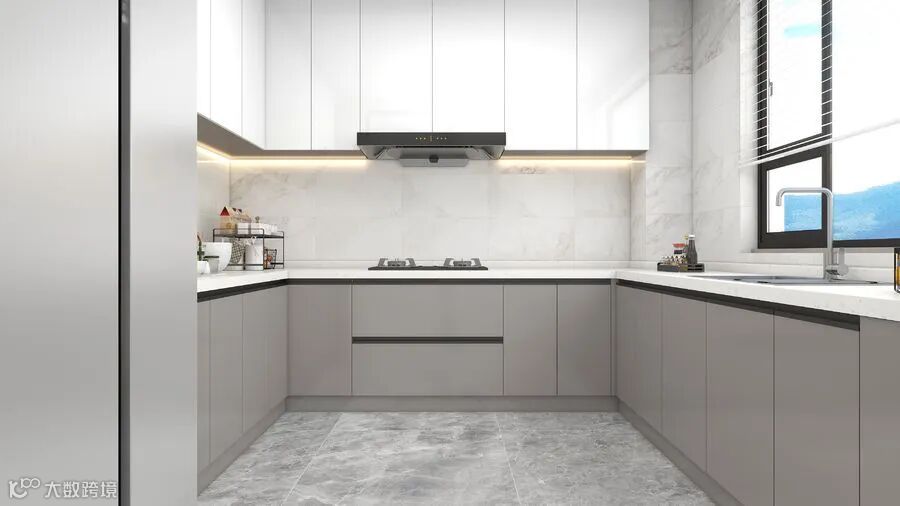 U型布置为厨房提供了更多的收纳空间,白+灰饰面的橱柜设计则丰富了视觉层次,在干净简约的空间效果之下,反而更能营造出生活的高级质感。