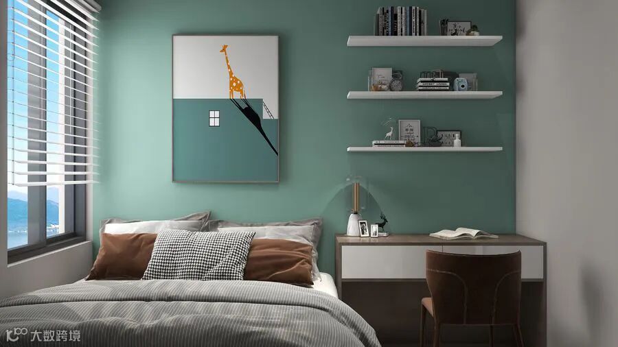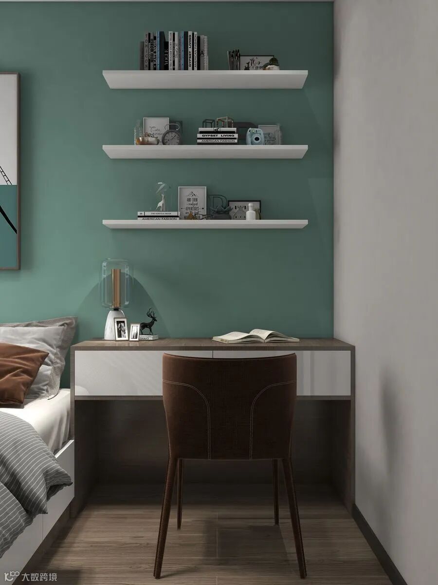 多功能室以绿色为整体背景,搭配深绿画饰与白色壁挂收纳,丰富空间层次,增添许多生活乐趣。榻榻米与书桌的组合则让小空间也变得更加实用,既能满足日常学习办公,也能偶尔休息。