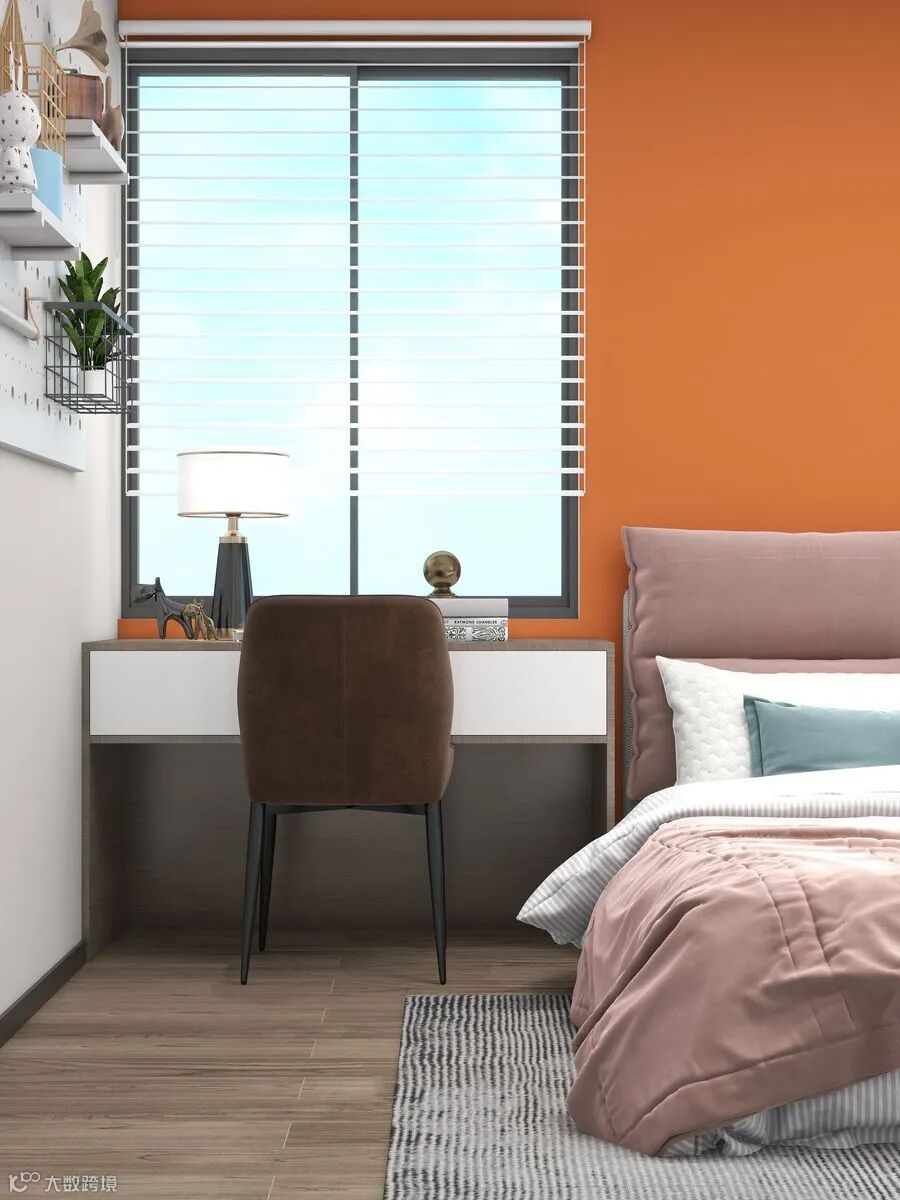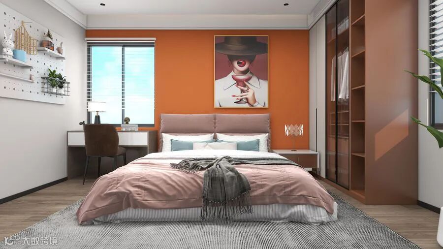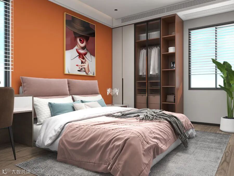 次卧设置窗户增大室内的采光,使空间更为通透自然,配合橘色背景墙与粉色床品,颜色相近却均呈现出活泼热烈的氛围,打造出舒适自在的休憩空间。