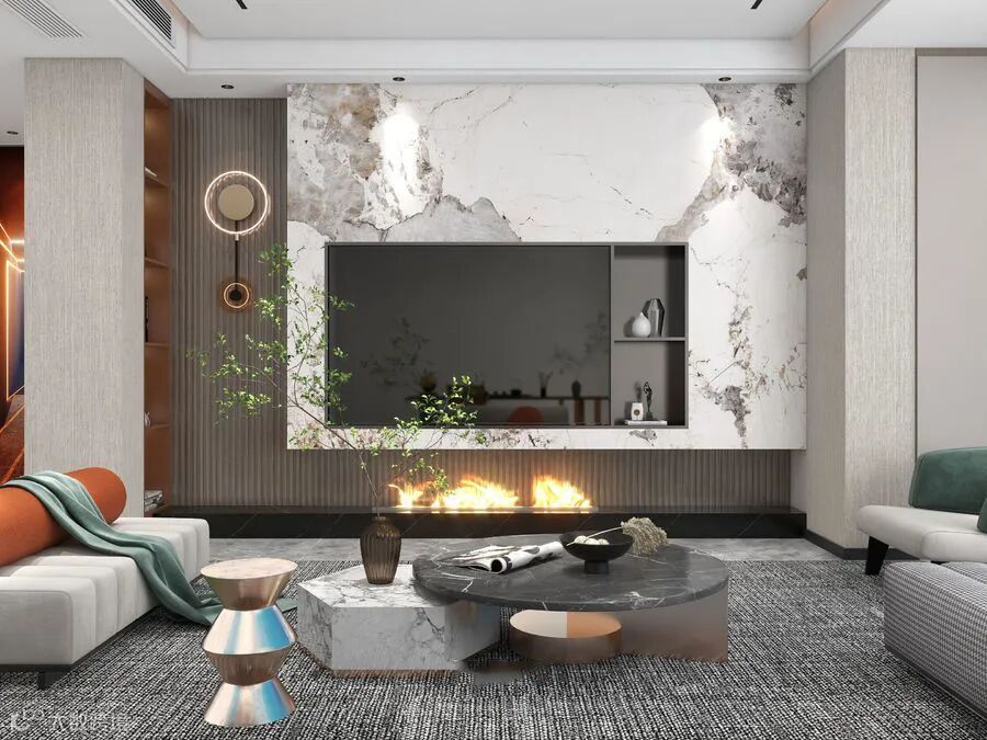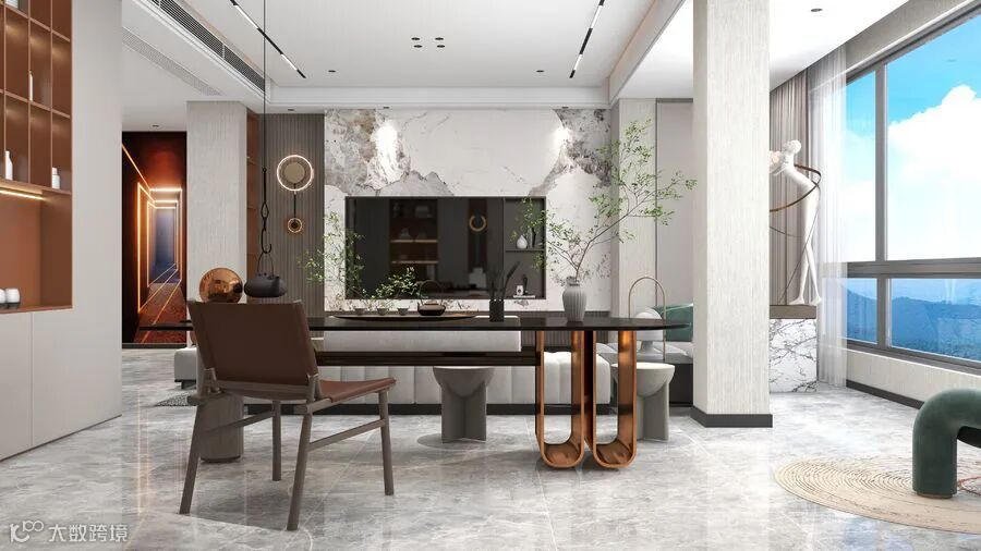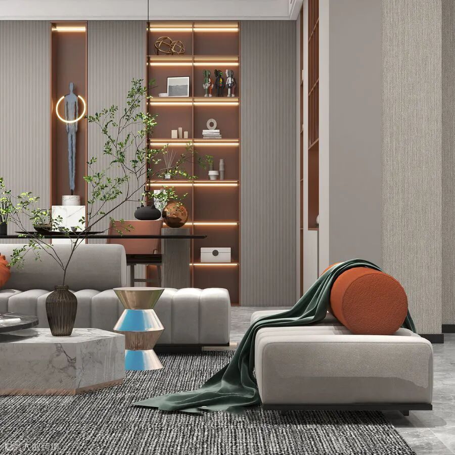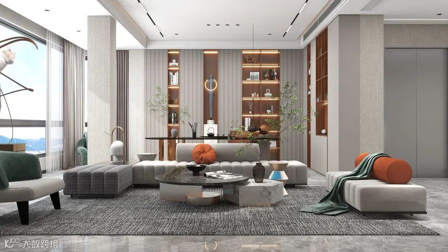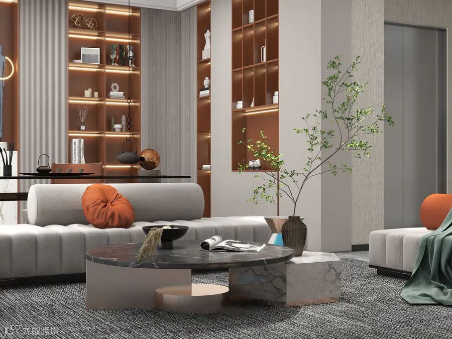 以沙发为分界线,将客厅划分为两个功能区。一侧作为平日里的休闲待客场所,一侧则是静雅惬意的品茗区。空间中多以高级灰奠定整体基调,辅以活力橙的点缀,更能彰显出室内环境的轻奢质感。