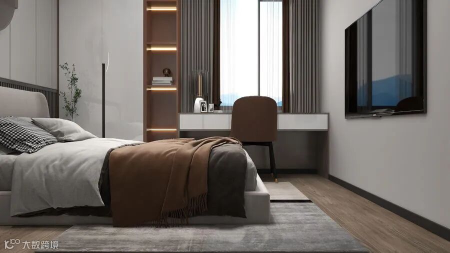 客卧空间相对较小,但为了给日常生活提供足够的收纳空间,在床的两侧均有布置白饰面收纳柜,而正对窗户的位置则定制了书桌,让办公学习两不误。