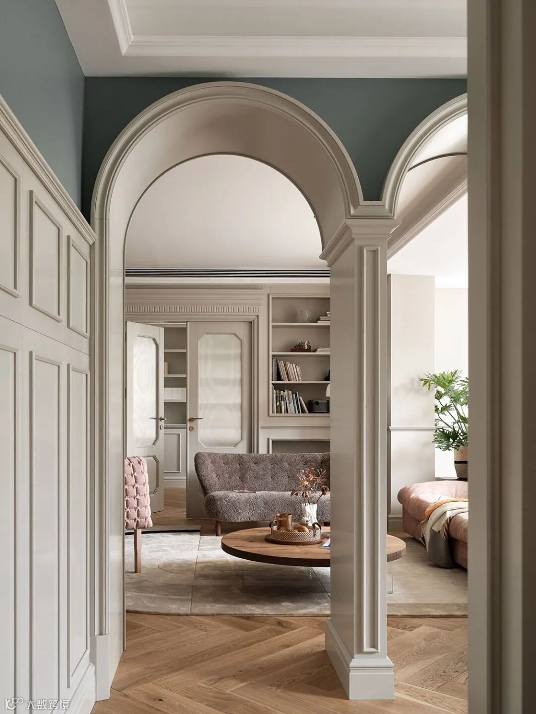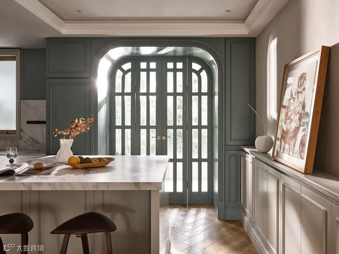 公共区域腰线贯穿始终,餐厨厅空间扩容1倍,温柔的原木色与法式复古的结合,搭配Tiffany蓝绿色,使得每一处细节尽显浪漫雅致,处处散发着法式的柔情。