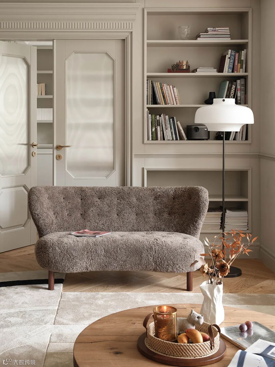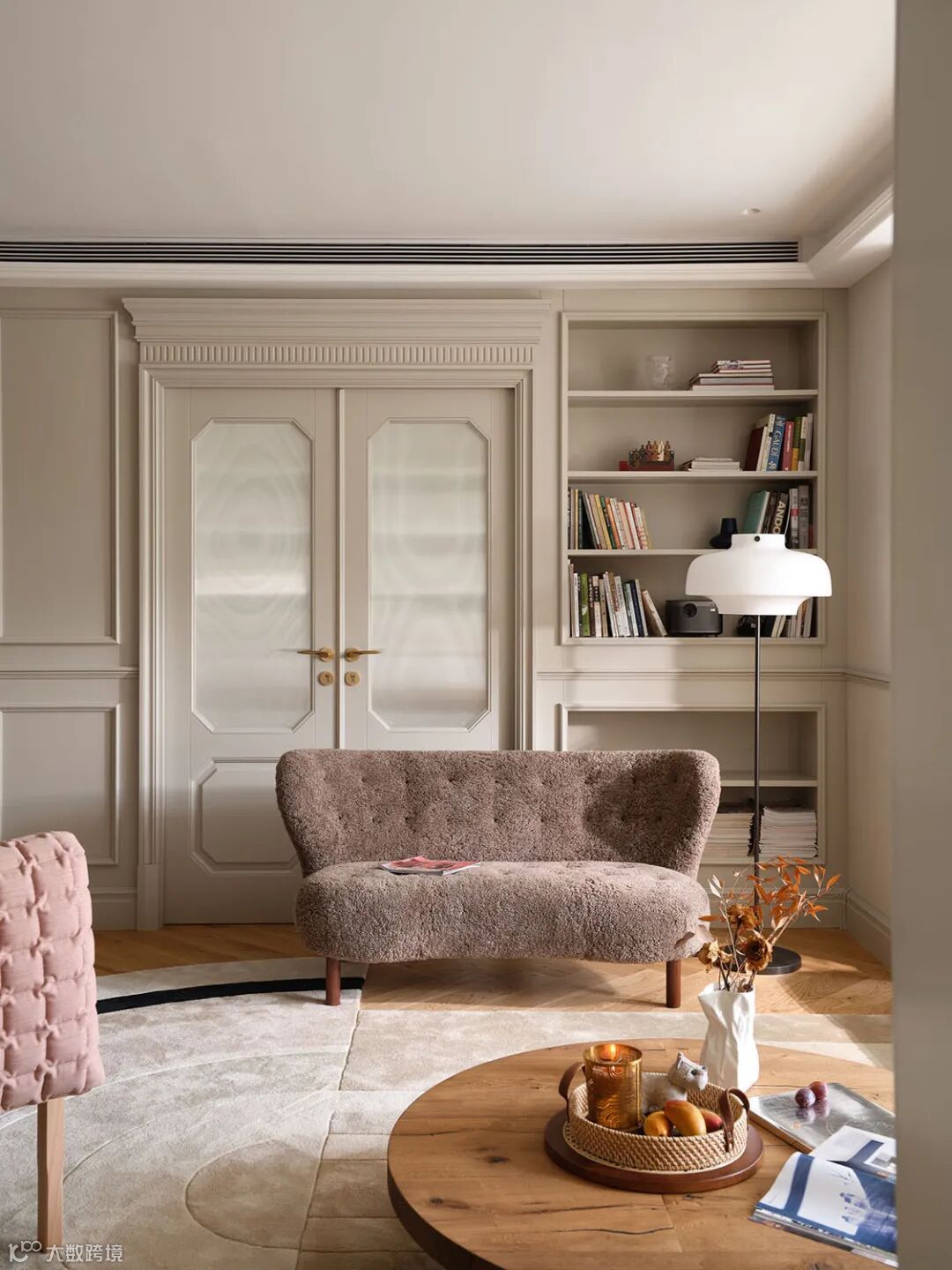 沙发背后设计内嵌书架,法式线条作为修饰,摆放些书本和投影仪,一到周末窝在沙发里看书或者看电影,慵懒又轻松。