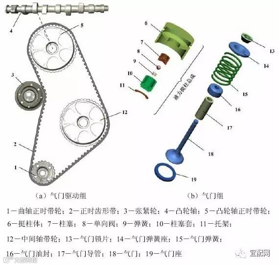 配气机构:发动机构成的基础建设设施之二,它的作用是按照发动机各缸工作循环的需要,定时地开启和关闭进、排气门,使混合气进入汽缸,而让燃烧后的废气排出汽缸。
