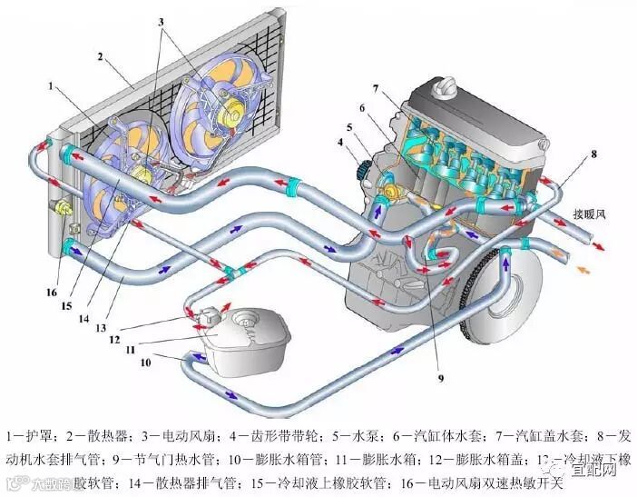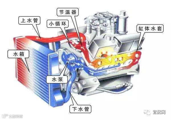 冷却系:为了使发动机不停摆,冷却系统开始工作了,它的作用就是强制地将发动机燃烧所产生的热量和各摩擦副运动中所产生的热量及时适量地散发出去,使发动机的温度保持在合理的范围内。