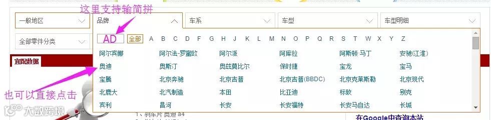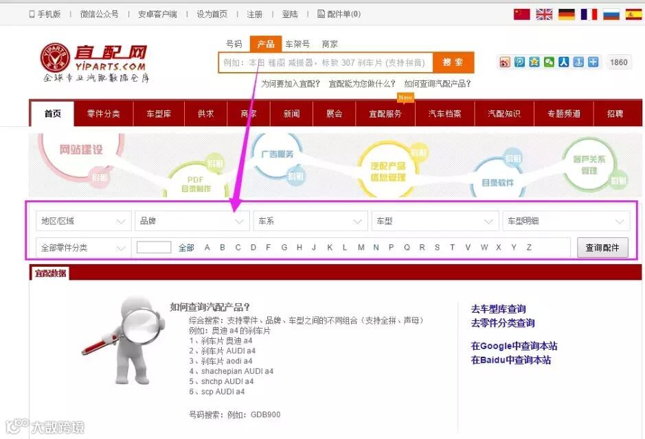 宜配网各位亲,好消息来了!宜配推出了通过车型查产品的服务了!包含欧洲一般地区车型和北美车型的查询 1 点击查询框上的产品,下面就会出现车型查询的栏目。