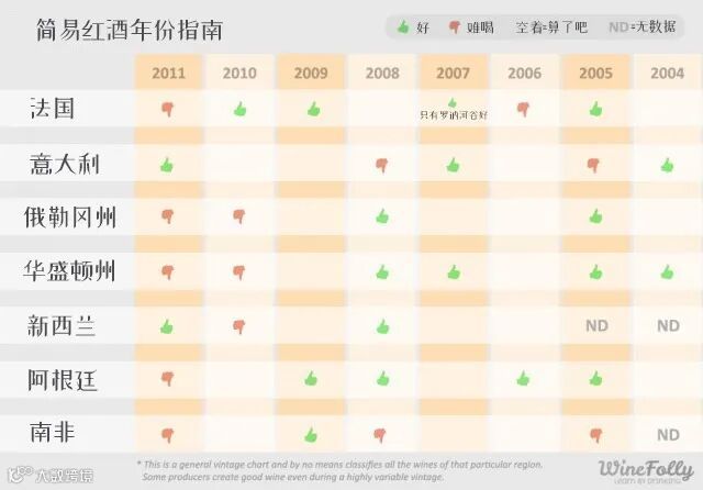 有一些生产商、葡萄园和葡萄品种比其他酒商更能应对气候变化。这张简易的小年份表涵盖了意大利北部、法国、俄勒冈、华盛顿、南非、新西兰和阿根廷等地2004、2005、2006、2007、2008、2009、2010和2011年份的 气候变化 / 葡萄酒质量 情况。