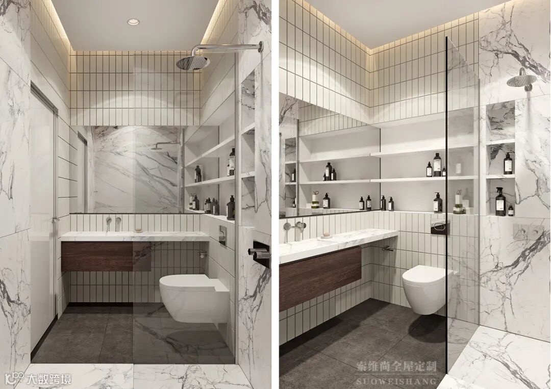 大理石质感的卫生间很干净通透,比较好打理,看着也很大气,真是棒极了。
