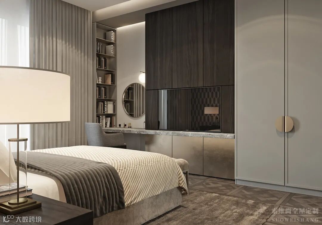 卧室设计深浅的色调搭配,弥漫着静谧安宁的氛围,舒适温馨、大气简约且不乏时尚的软装元素,诠释着主人对美的品味追求与超凡脱俗的气质。局部细节的摆件让空间不过于沉闷,展现出独特个性的美。