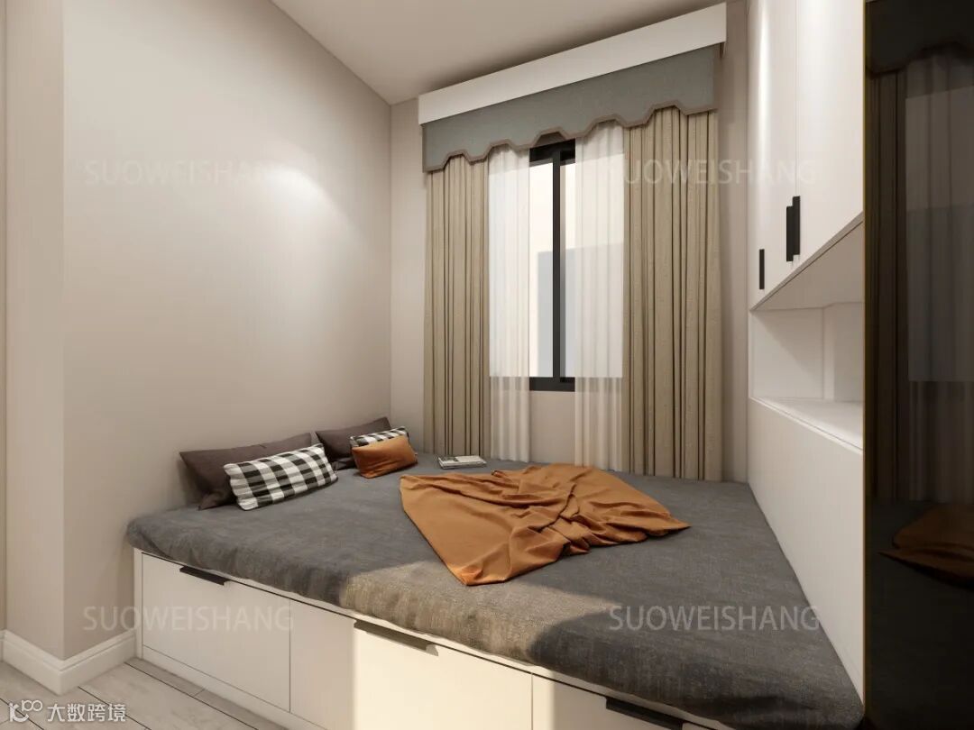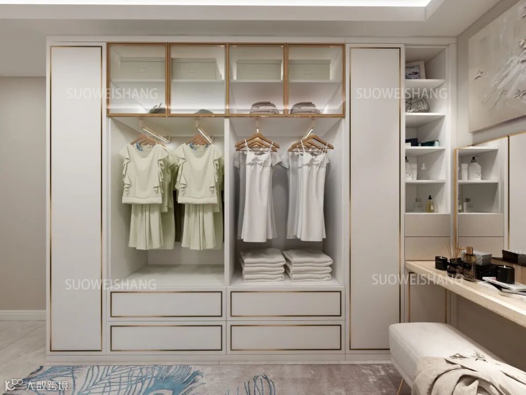 衣帽间增设的开放式衣帽间,采用60%的开放设计,没有太多封闭的空间,使得生活更加随性。不过考虑到积尘问题,窗户对面的空间增加了部分门板,用于放置比较贵价和难保养的大衣连衣裙等。