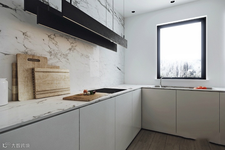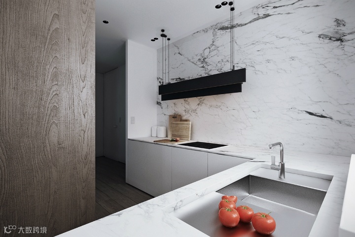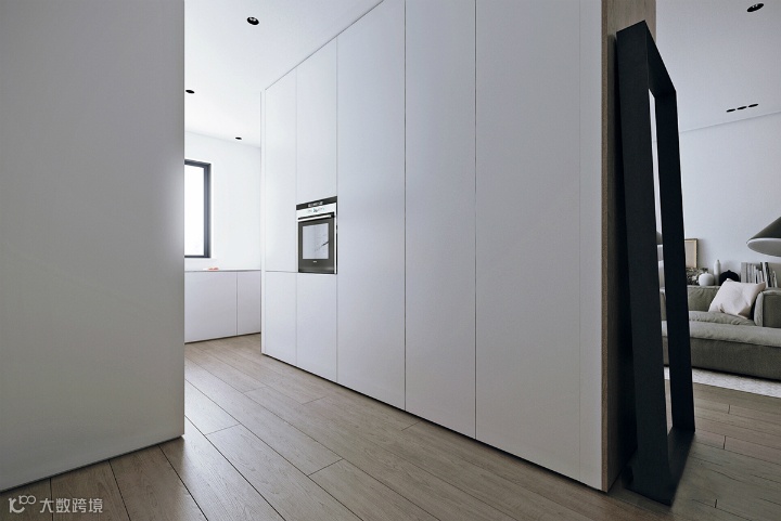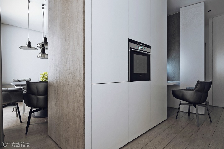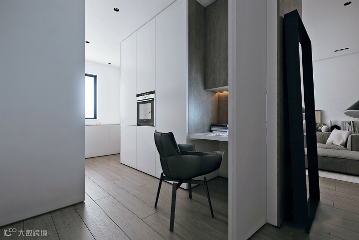 厨房空间易于维护,而且设计具有现代感和超现实主义色彩。炉顶、水槽和排气扇等必需品都被遮住了。散发出一种优雅的概念。一扇无把手的门,就会出现一个自动工作站。
