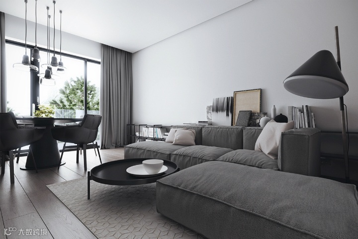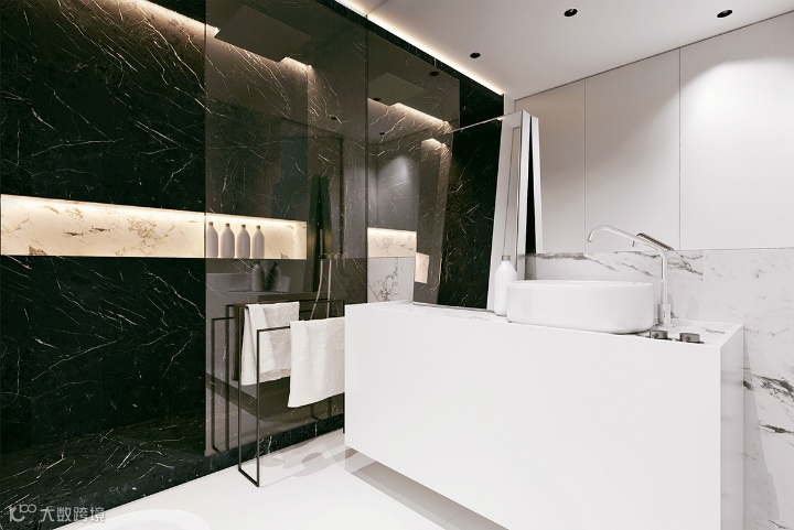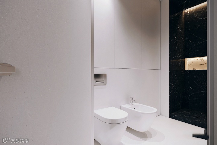 浴室采用另一种配色方案,但与整个住宅的整体灰色主题完美融合。光滑的墙壁和固定装置以黑色琉璃墙为重点,别致、实用且极简。
