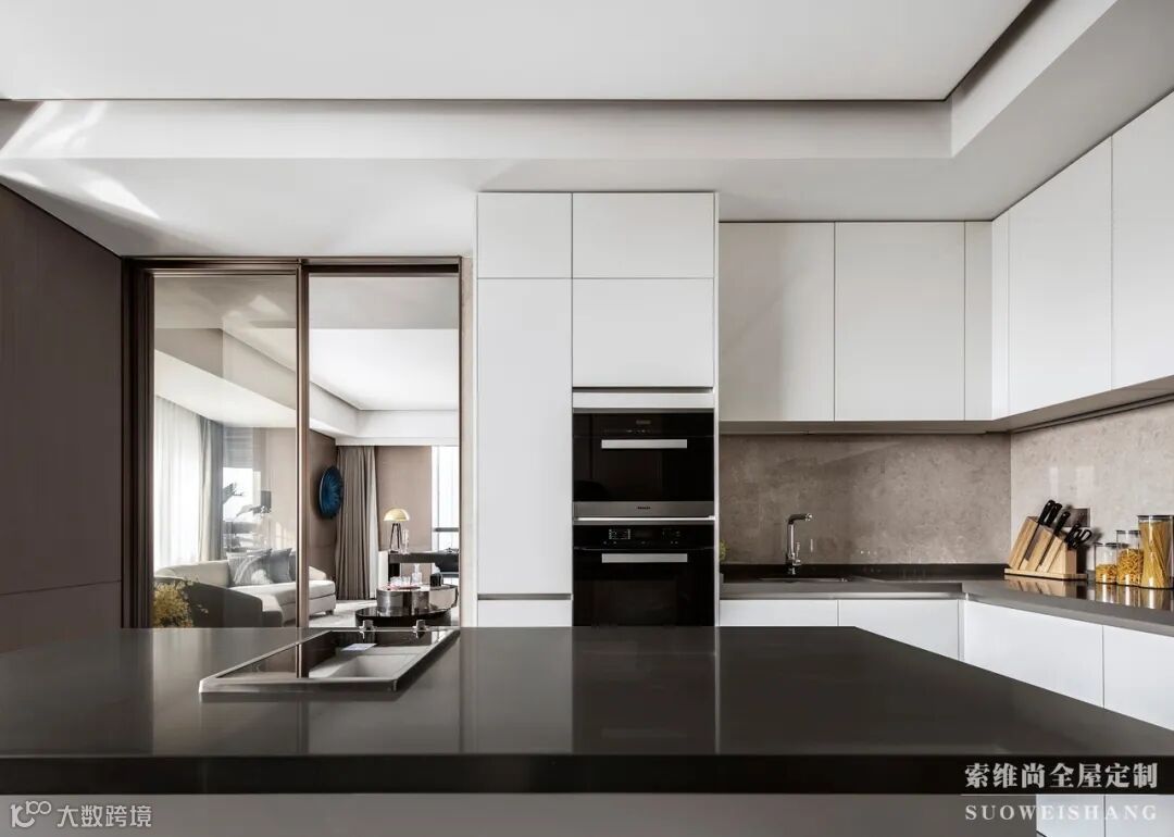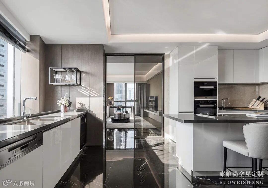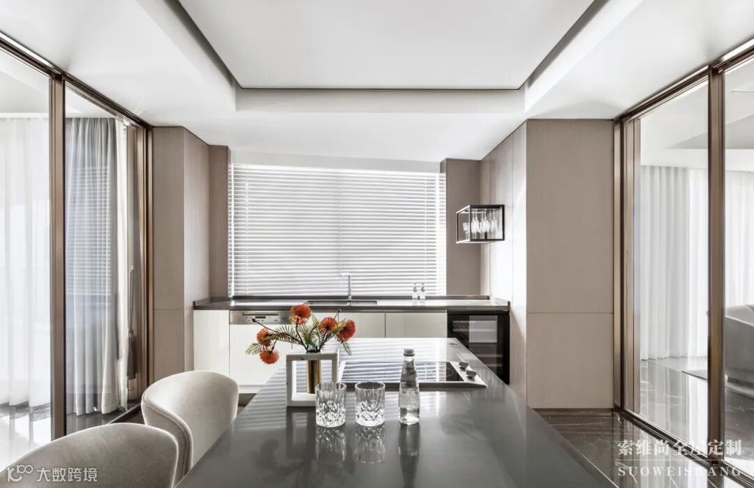 厨房采用推拉玻璃门,关上时隔绝油烟,拉开时形成开放的餐厨空间。