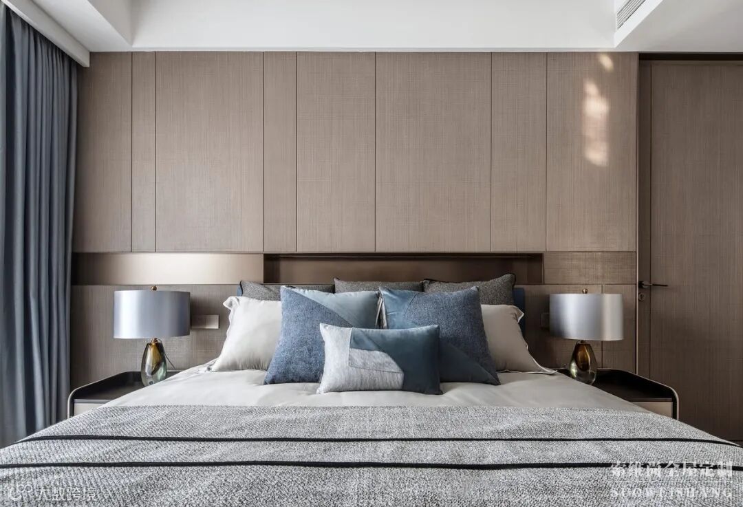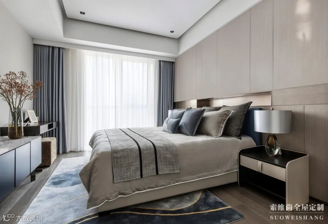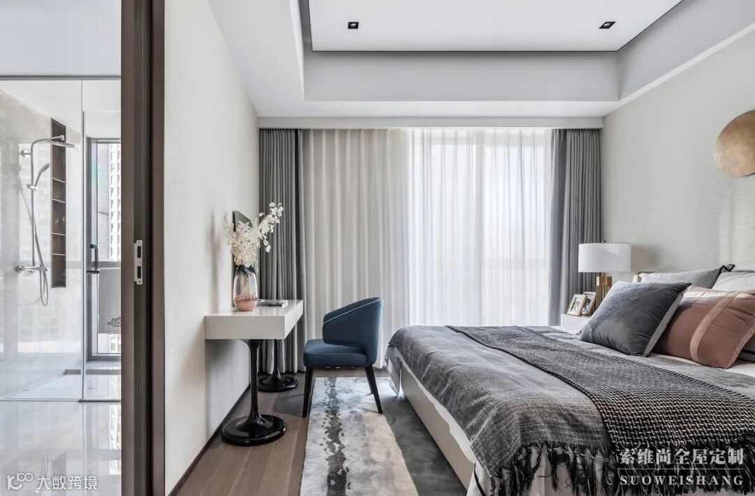 主卧室,大面积落地窗的卧室,以灰色调为基底,营造出优雅柔和的睡眠环境。