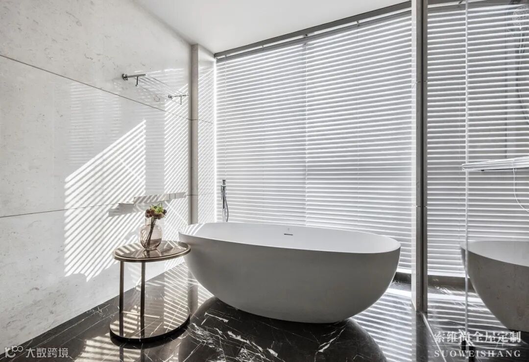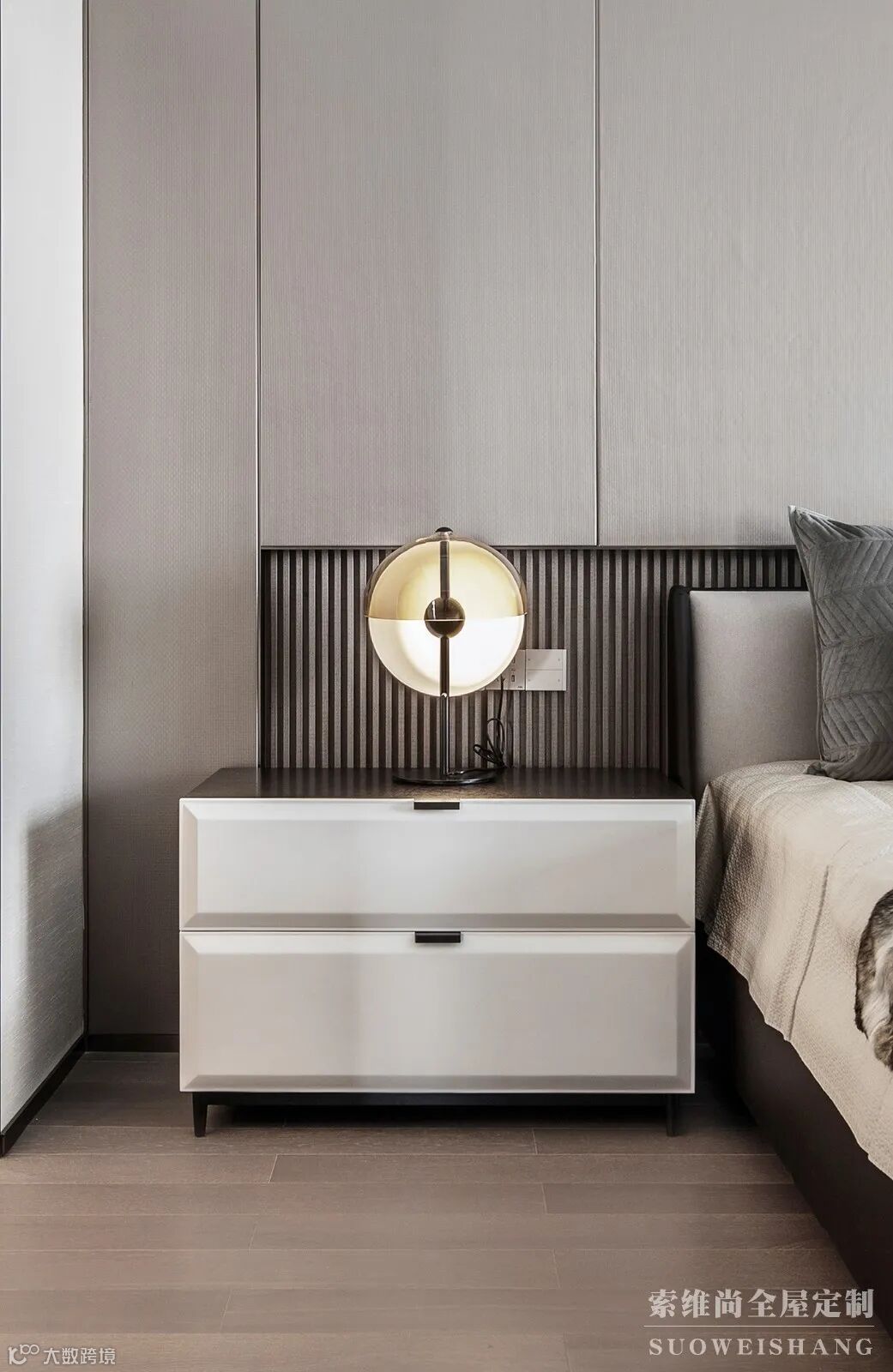 次卧温润的木质床头柜,白色书桌,丰富的纹理与材质,让这样奢华与极简融合的空间美妙又时髦。