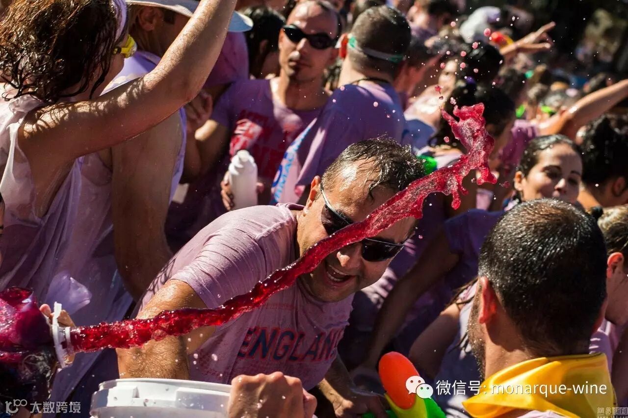 在“泼酒节”上,大家身着白T恤,用当地盛产的红葡萄酒作为弹药,通过各种水枪和各式各样的容器相互泼撒,直到所有人身上都被弄湿染成紫红色。