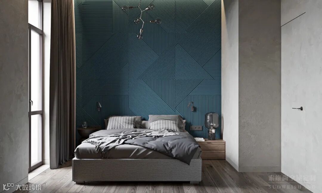 床头的墙面设计非常的有活力,蓝色的设计赶走了原本卧室慵懒的氛围,