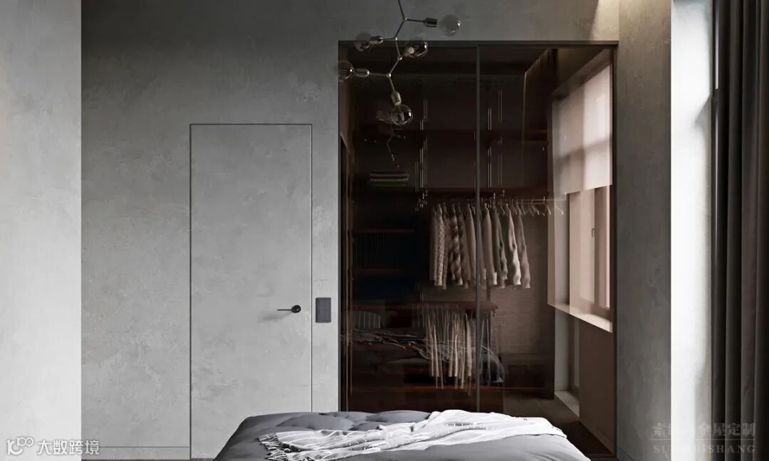 卧室带有一个步入式的衣帽间,非常的实用。在色彩的搭配上用了少有的茶色设计,给人一种不一样的都市设计感。