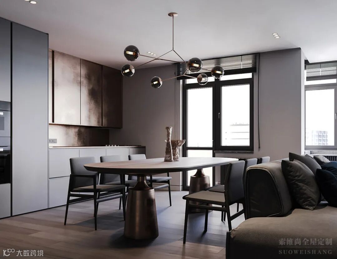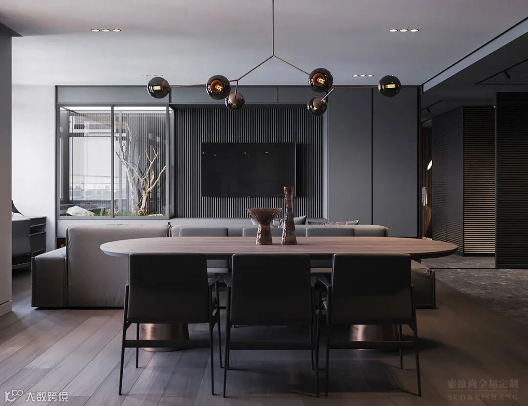木色的餐桌,艺术感十足的吊灯,不落俗套且很有个性,看似简单随意,