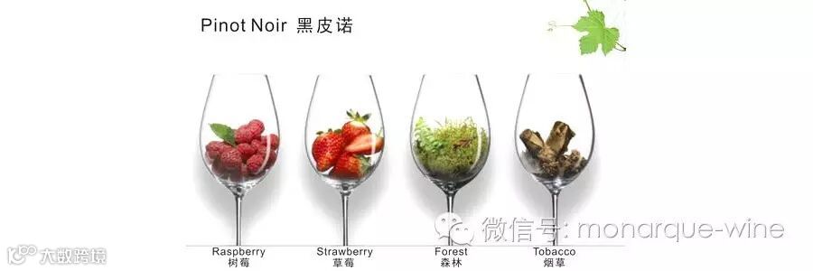 黑皮诺葡萄酒:相比赤霞珠和梅洛葡萄酒,黑皮诺的颜色最浅,一般带有水质边缘。它的香气十分馥郁,带有覆盆子、草莓、深色樱桃和玫瑰的迷人芬芳。