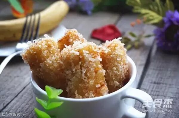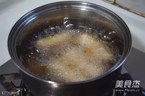 沾一点面包糠,油里炸一下,吃一口,金黄色的外皮,酥脆包裹着软糯。