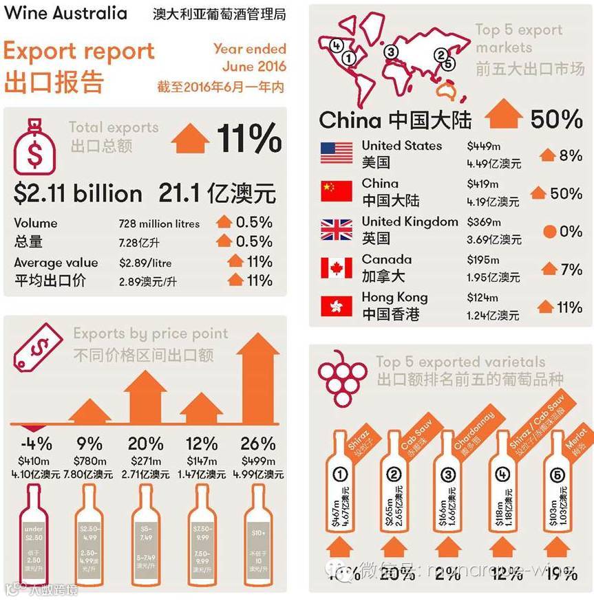 据澳大利亚葡萄酒管理局(Wine Australia)最近发布的出口报告,截至2016年6月底的一年内,澳大利亚葡萄酒出口额仍然保持强劲的增长势头。其中,高端瓶装酒增长势头强劲,离岸价格在10澳元每公升及以上的澳大利亚葡萄酒对中国大陆的出口剧增71%。