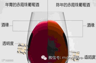 葡萄酒年龄比如产自波尔多的红酒,“生命初期”时呈现出深红色,之后颜色逐渐变淡,转成紫红色,直到砖红色,在“生命末期”时,颜色甚至会淡到接近琥珀色。