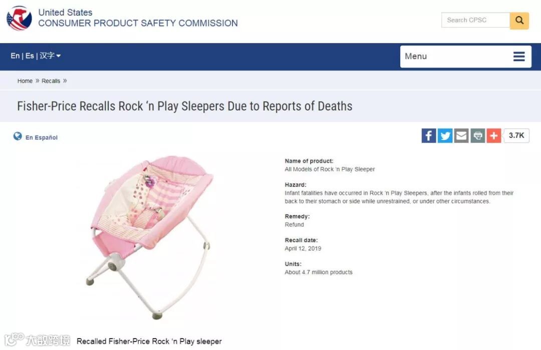 召回原因:该产品发生过婴儿在不受束缚的情况下从其背部翻到腹部,或者是其他情况下,导致婴儿死亡的事故。