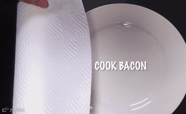 ▼煎完培根还得洗锅,是不是很麻烦!用微波炉就可以做到。垫张厨房用纸在碟子上,然后放上培根,再盖上一张厨房用纸,放入微波炉叮2分钟,焦香培根出炉啦~