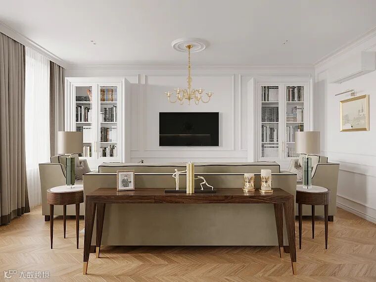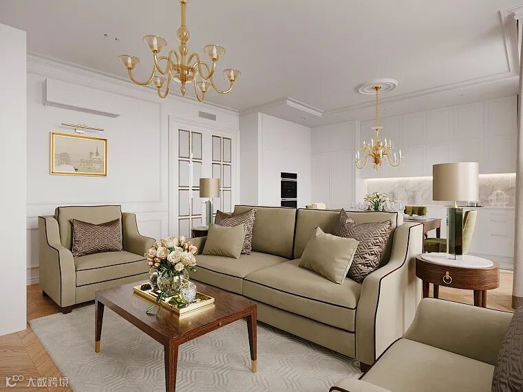 客厅作为待客的区域,视觉感简洁明快,有着美式奢华贵气的历史风味却也不乏休闲式的浪漫感觉。