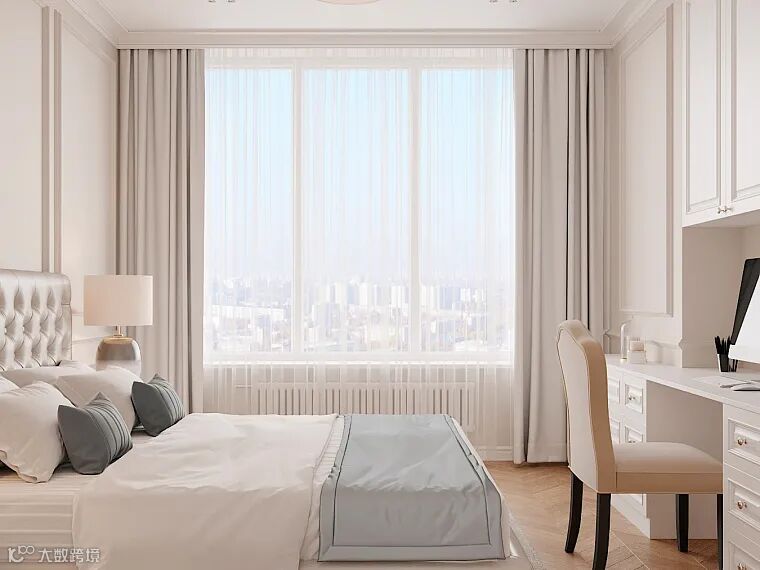 落地窗保证了整个空间光线的充足,轻纱营造出浪漫柔和的氛围。