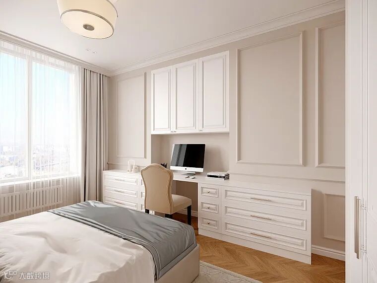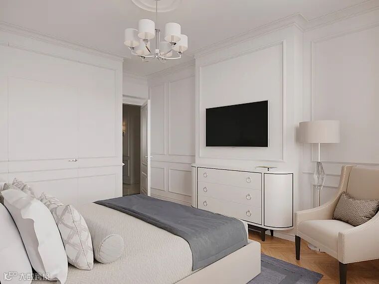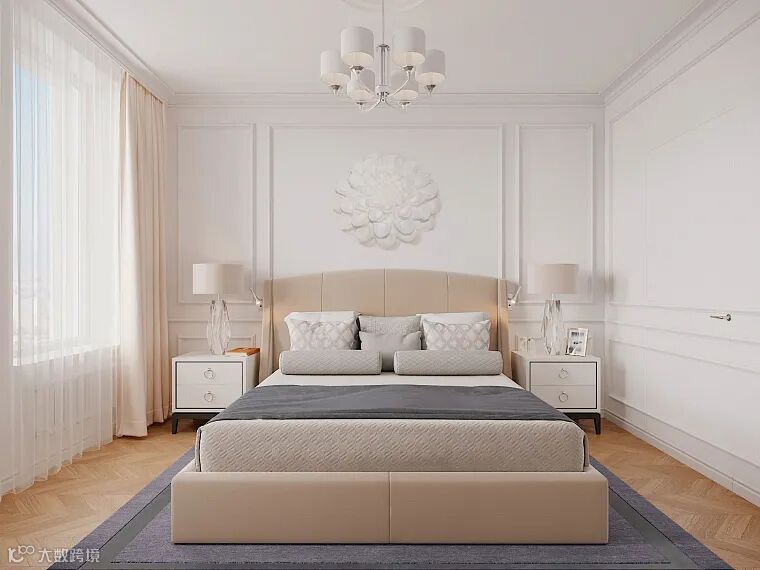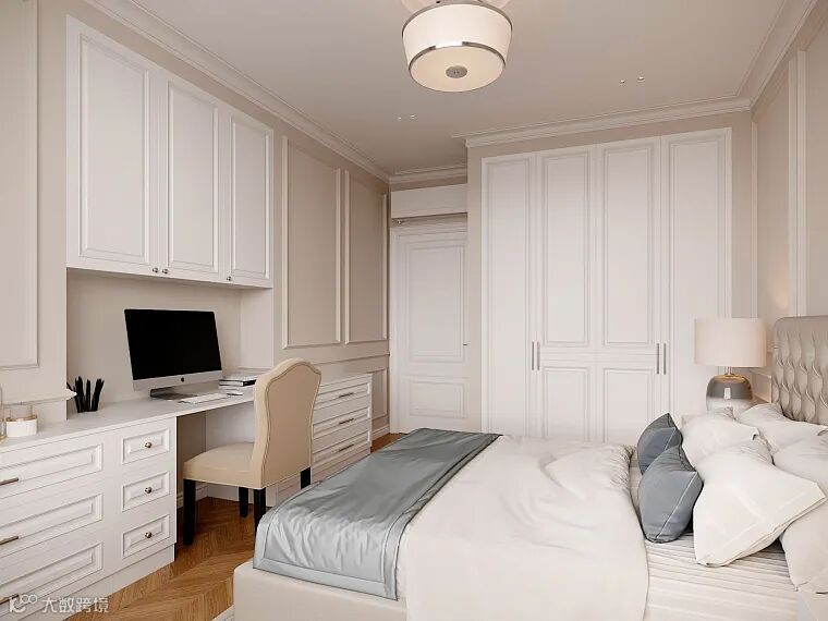 卧室同样延伸了主色彩,浅色系营造出安静的空间氛围,柔雅蓝色增添了室内的清新感,床品还原复古味道,奢华贵气。