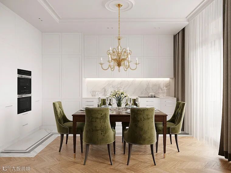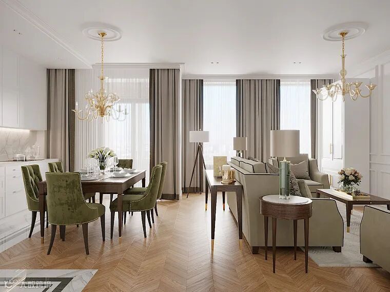 家具采用绿色调:沙发组的烟熏开心果色与餐椅相呼应,呈现出浓郁的阳光沼泽色。