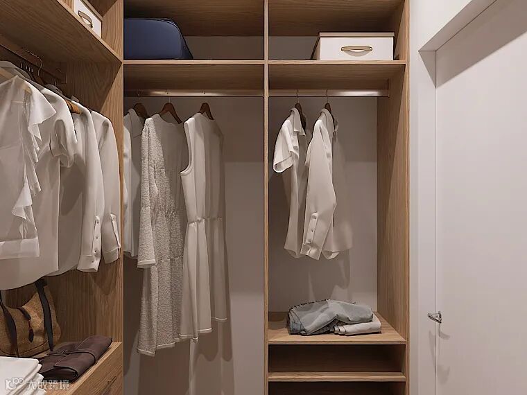 步入式衣帽间,空间不是非常大,但布局井井有条。