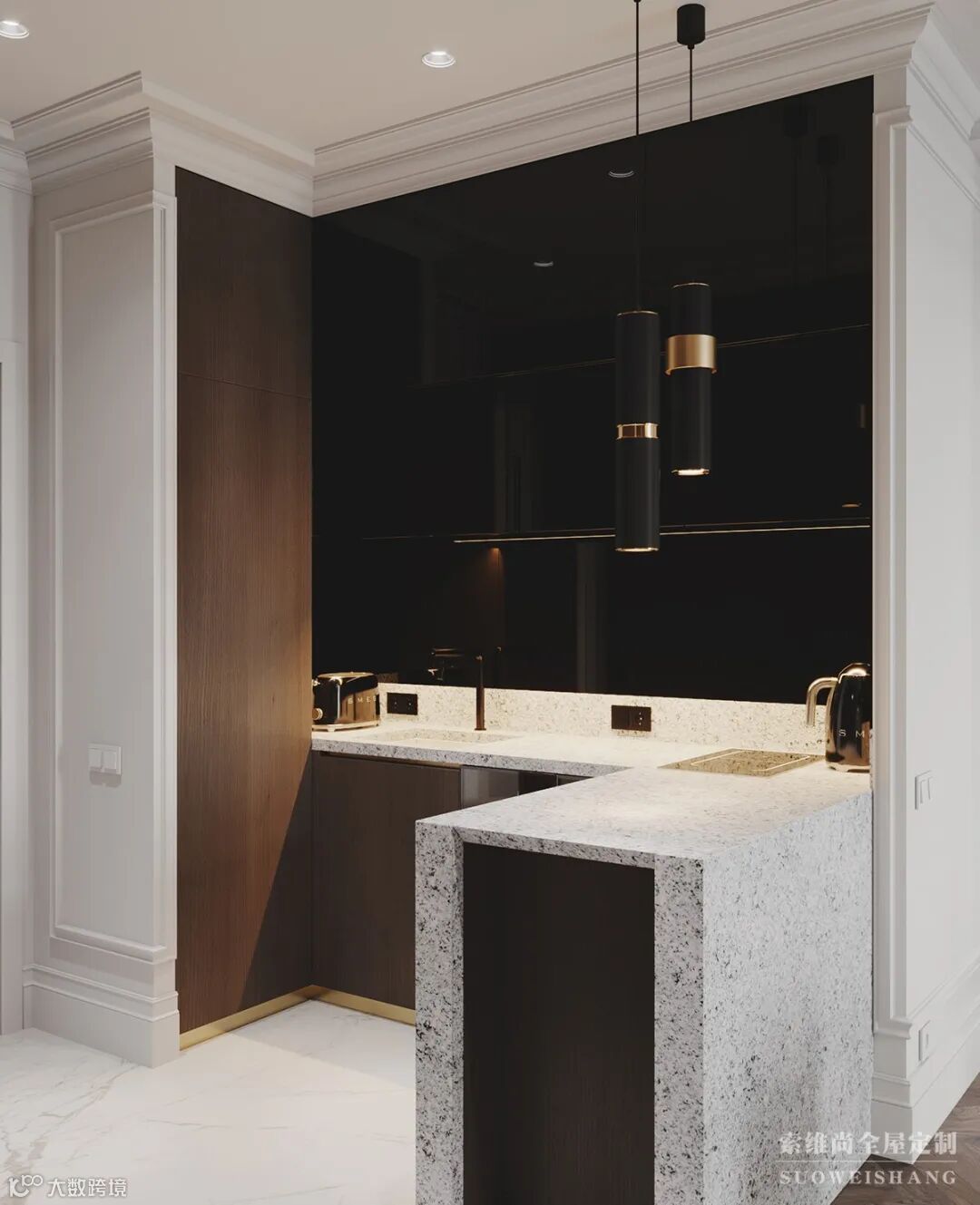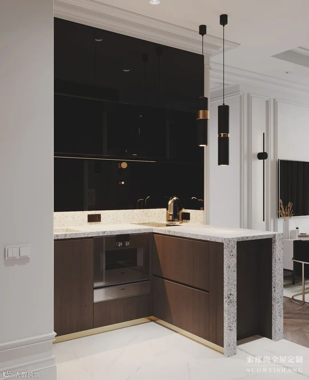 餐厨在客厅的一角,没有隔断,黄铜的点缀非常抢眼,时尚轻奢,色彩协调。