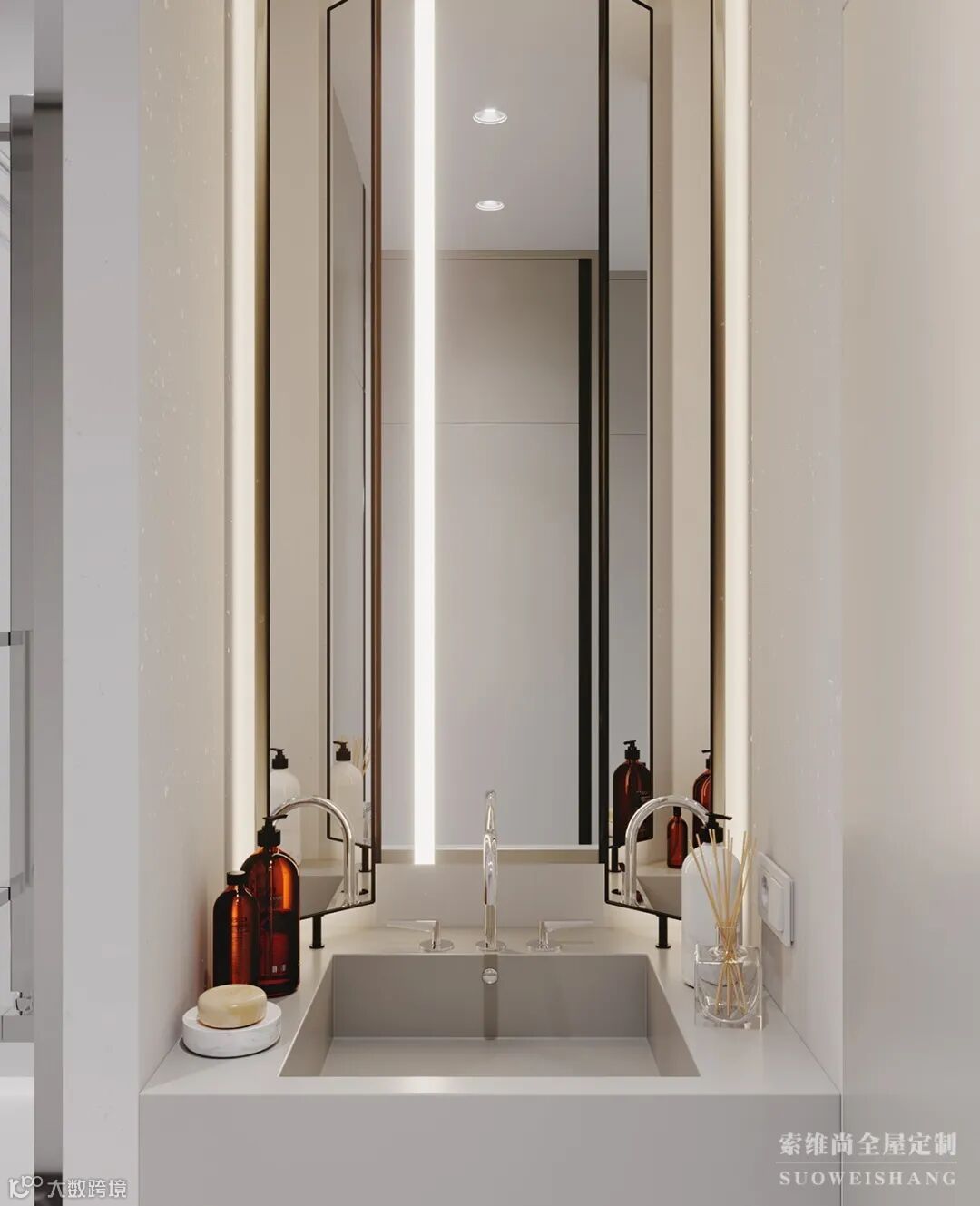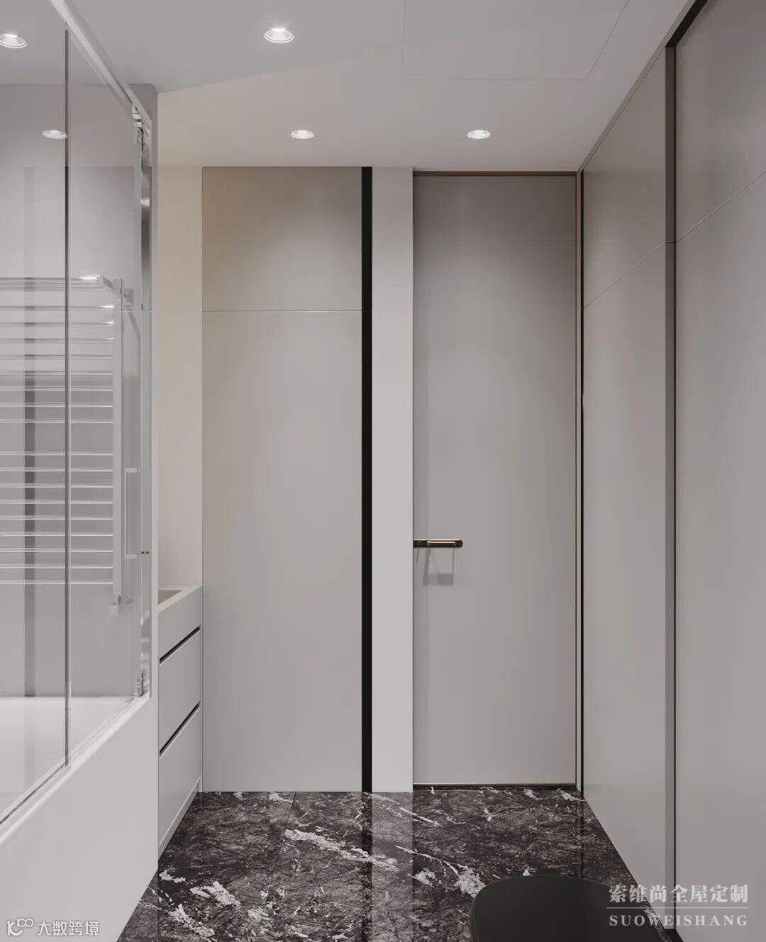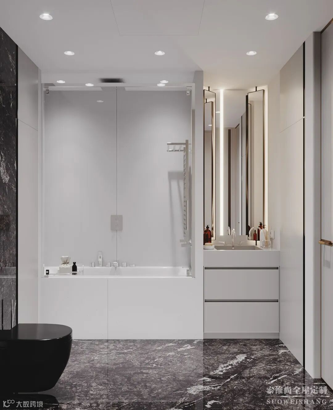 卫浴间抬高了5个公分,四周嵌入灯带设计,整体显得轻盈大气。