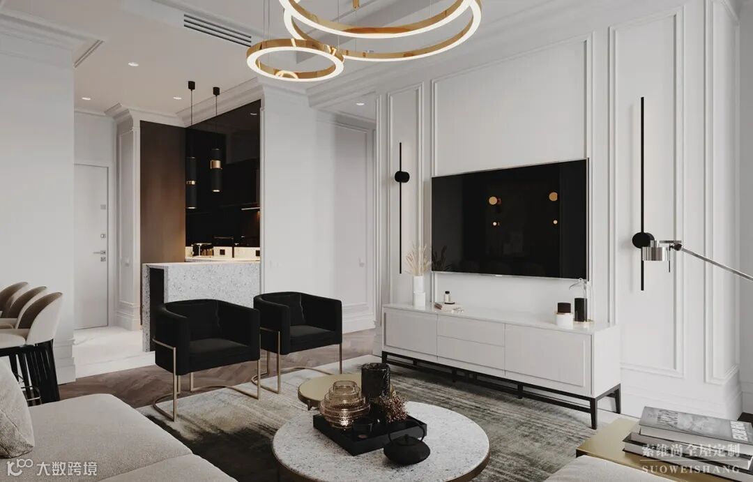 开放式客厅,白色的石膏线墙,整个空间简洁精致、明亮而富有光泽。