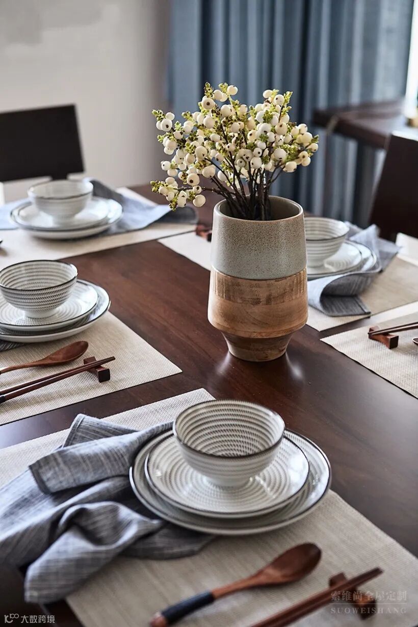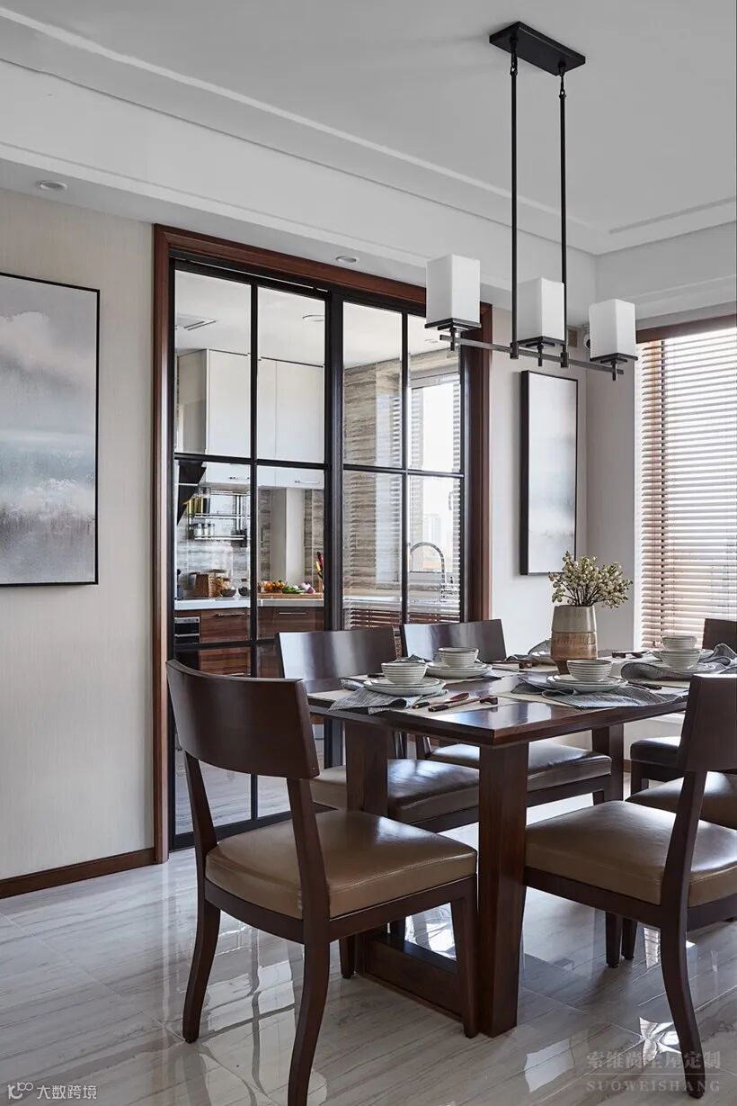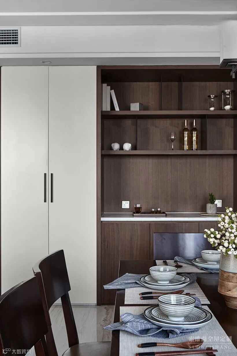 餐厅背景墙做个复古质感的餐边柜和封闭收纳柜,摆上精致的装饰品,结合丰富的收纳,显得格外的大方。