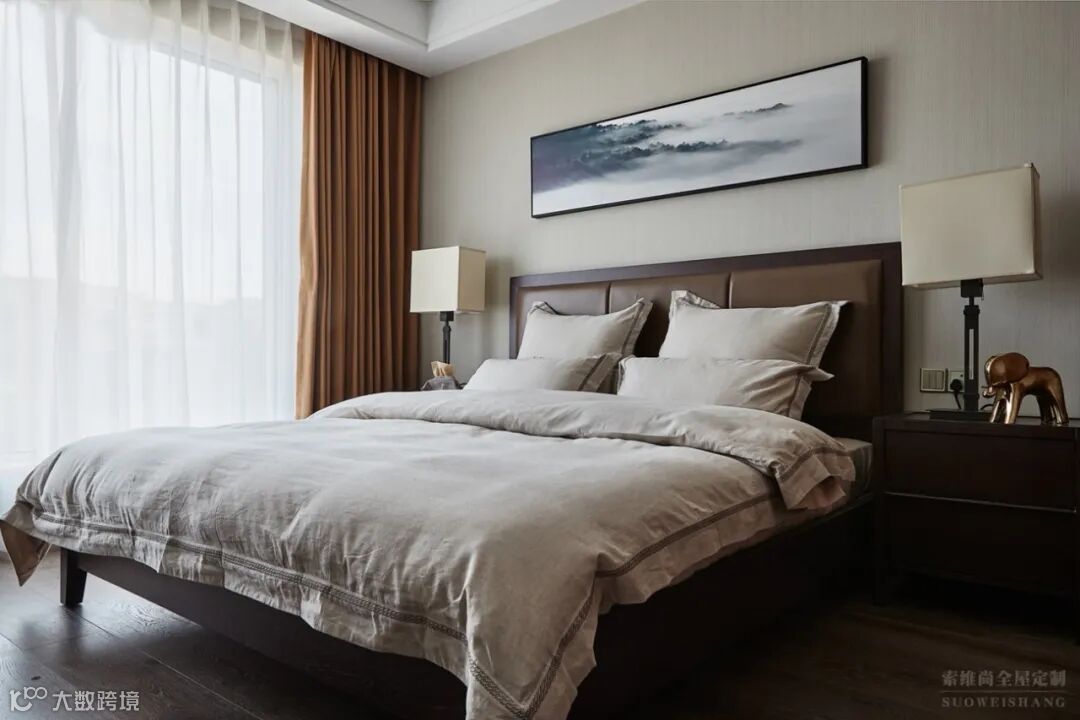 主卧床头挂了一幅意境山水画,禅意悠远,很有感觉的挂画。卧室的配色稳重又带有人文气息,淡淡的禅意,能让人放下身心享受生活,体验生活的慢节奏状态。