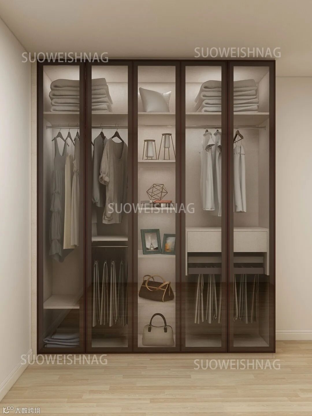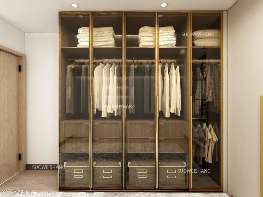 光亮的玻璃在暖色灯带的映衬下,在半透半隐之间,让整个衣柜显得现代时尚,同时又透着轻奢与低调。