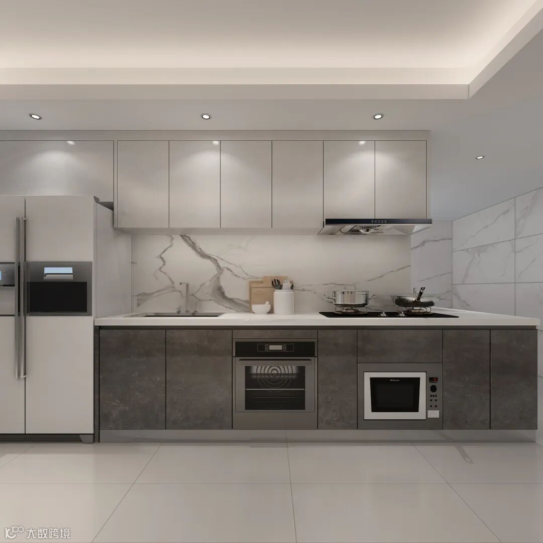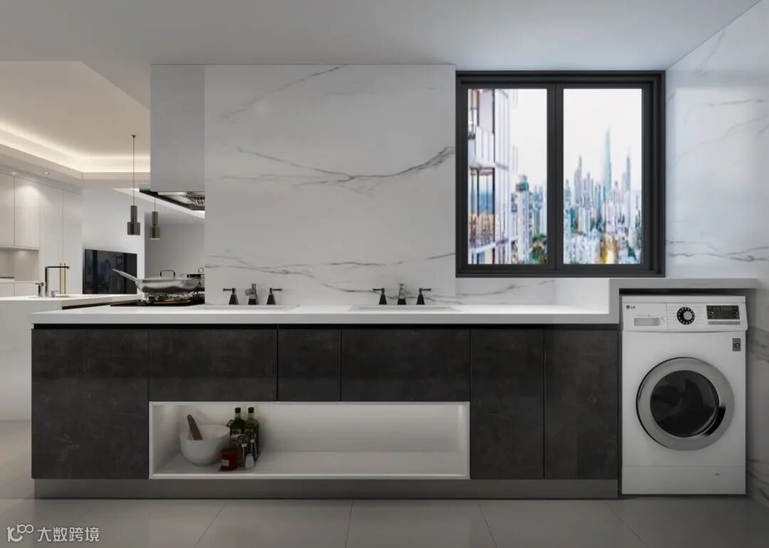 厨房设计成这样,不仅仅满足日常功能的需求,还让下厨变成了一种享受,厅与烹饪区连接在一起,既是吧台,也是隔断,大理石的台面在顶部的吊灯的渲染下,很贴合室内风格。