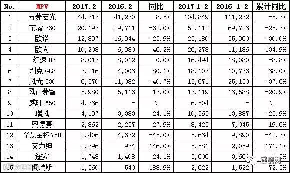 2017年2月MPV销量整体下滑、但1-2月整体销量仍有5款MPV呈现上升趋势:长安欧尚增幅46.2%、累计增幅134.9%位列第四,别克GL8增80.1%、累计增幅68%;本田奥德赛微增约20%;本田艾力绅、金杯阁瑞斯增幅较大。