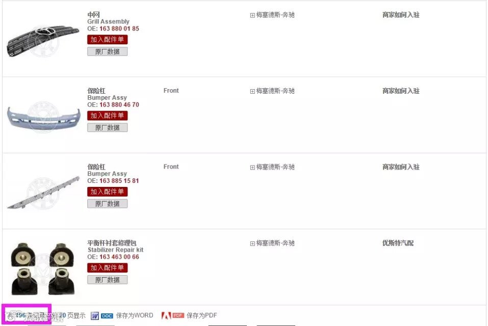 第二步: 该车型的所有产品全部列出,一共是:196个产品