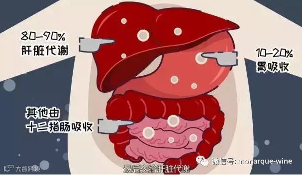 当酒精进入我们体内,其中只有10%的乙醇能通过尿液或呼吸直接排出体外,另外90%都是被胃和十二指肠收入囊中,然后随着血液在身体里御驾巡视一圈后到达肝脏进行代谢。