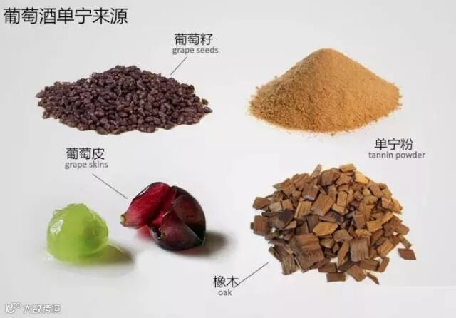 果皮较厚的酿酒葡萄,如赤霞珠(Cabernet Sauvignon)和西拉(Syrah)等,由其酿造的葡萄酒单宁含量会比较高。
