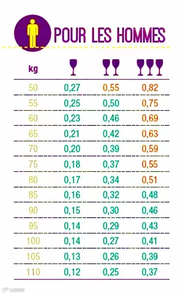 男人饮酒对照表:50公斤的男人空腹喝下12%酒精浓度的100ml酒液后,血液中有0.27 g/1公升的含酒量,以此类推。橘字代表超出法国酒商团体的建议量。