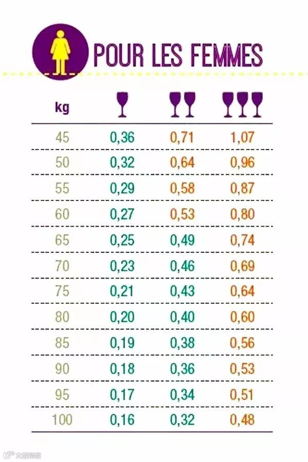 女人饮酒对照表:50公斤的女人空腹喝下100ml酒精浓度12%的酒液后,血液中有0.32 g/1公升的含酒量,以此类推。体重越重,血液含酒精量越少。橘字代表超出法国酒商团体的建议量。