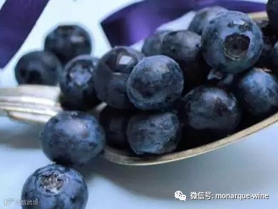 蓝莓(Blueberry),花青素含量极高的小浆果,粒小、皮微厚但不涩,果肉柔软,果汁充沛,酸甜适人。蓝莓的香气在葡萄酒中并不十分明显,在气候偏暖的葡萄酒产区和果实比较成熟的葡萄酒中比较常见(如:马尔贝克、西拉),经常和桑椹及醋栗的融合在一起。