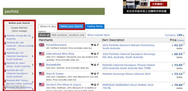 有的时候如果输入的名字不够完整,不会直接弹出酒款的页面,需要在【Refine your Searcher】的分栏下找到你所寻找的对应酒款。